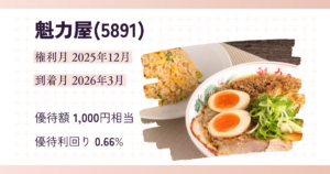 | 100株優待 | 1,500円(1.17%) | 優待権利月(到着月) | 12月(3月) |