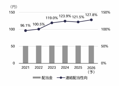 | 100株配当 | 5,200円(4.05%) | 配当権利月(振込月) | 6月・12月(3月・9月) |